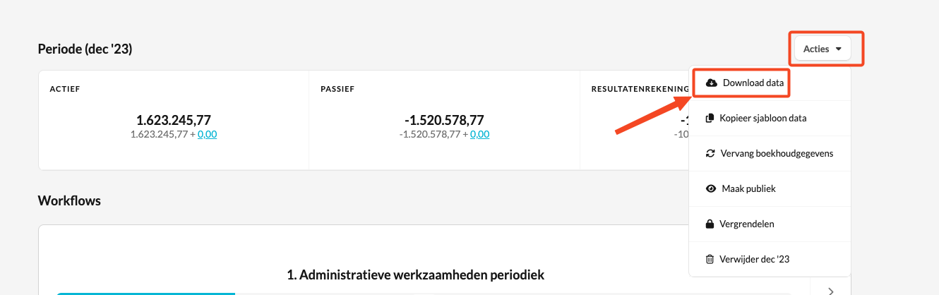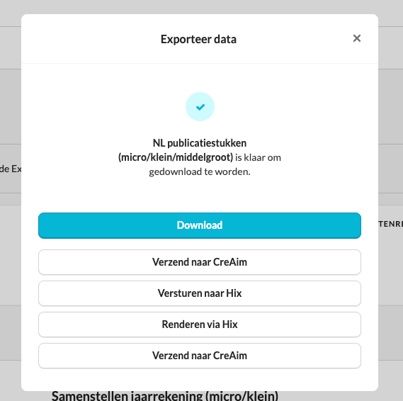 - Hier kun je het xbrl bericht downloaden (om in uw deponeringsportal te uploaden) of rechtstreeks versturen naar een deponeringportal indien er een koppeling actief is (bijvoorbeeld, Hix, CreAim, Silverfin ondertekenplatform, etc.)